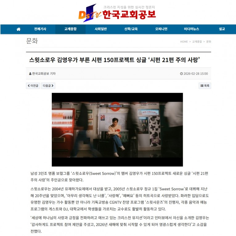 뮤직타임 [기사] 스윗소로우 김영우가 부른 시편 150프로젝트 싱글 ‘시편 21편 주의 사랑’(한국교회공보(DSTV))