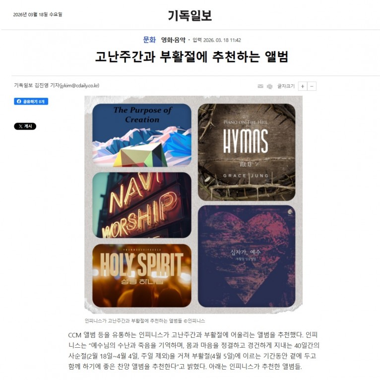 CCM 앨범 등을 유통하는 인피니스가 고난주간과 부활절에 어울리는 앨범을 추천했다. 인피니스는 “예수님의 수난과 죽음을 기억하며, 몸과 마음을 정결하고 경건하게 지내는 40일간의 사순절(2월 18일~4월 4일, 주일 제외)을 거쳐 부활절(4월 5일)에 이르는 기간동안 곁에 두고 함께 하기에 좋은 찬양 앨범을 추천한다”고 밝혔다. 아래는 인피니스가 추천한 앨범들.